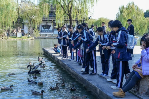 穿过烟雨朦胧的长堤春柳,驻足精巧别致的徐园,登临湖中胜境小金山,远眺乾隆垂钓的钓鱼台,仰望如莲花盛开的五亭桥……每一步都仿佛踩在历史的韵脚上,每一景都对应着千古流传的诗句。同学们在真实的场景中与古人神交,于湖光山色间真切感受到了中华诗词的永恒魅力与园林艺术的精妙绝伦。