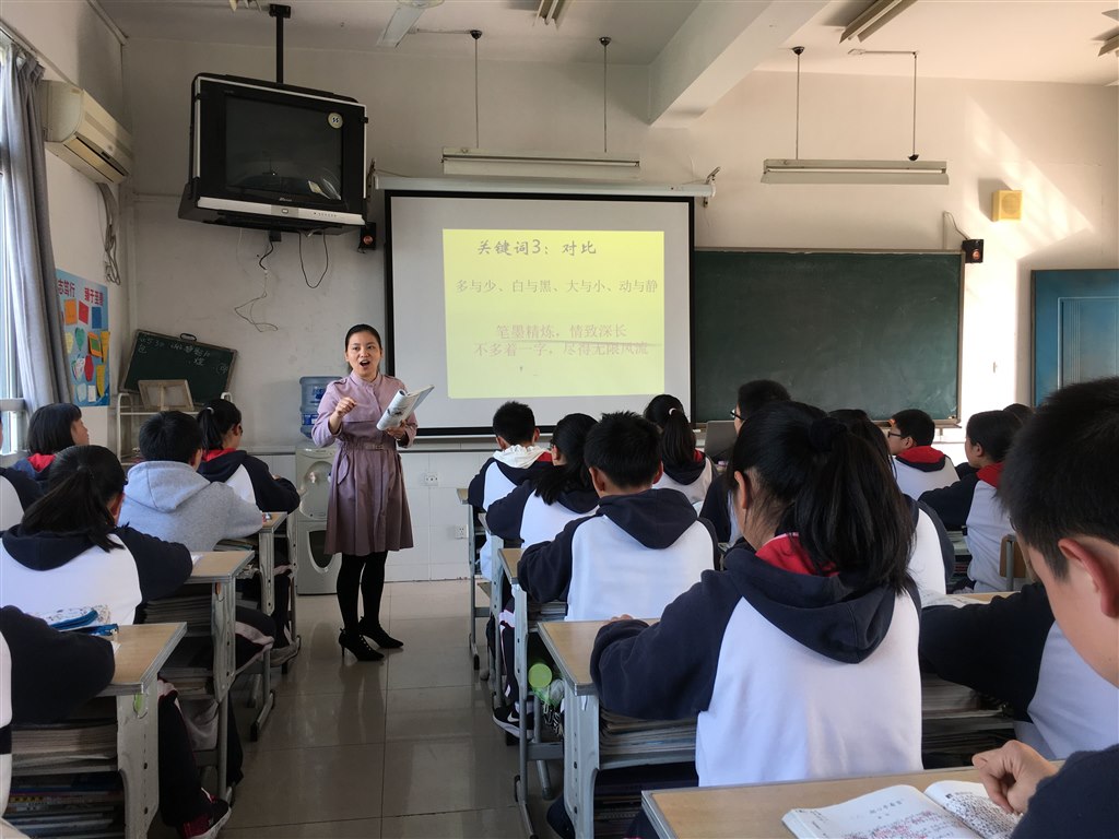 首先,我校刘璐老师为大家开设了一堂研讨课《湖心亭看雪》。课上,刘老师以“四读”串联起整个教学过程:一读课文,读准字音,注意节奏;二读课文,理解释义,疏通文本;三读课文,披文入情,感同身受;四读仿诗,得其形,悟其神。“四读”设计,环环相扣,层层深入。涵咏,品味,感悟,创作,结合文本互证、书画鉴赏、知人论世等教学方法让课堂的温度、广度、深度和高度兼备。在刘老师诗化般语言的带领下,以“关键词”为核心,以“文化”为重心,以“痴”为切口,以“言语”为立足点,言文合一,让民族气节在语言文字中徜徉,让爱国情怀在古典文化中流淌,直达学生的心灵。学生通过对五组“关键词”的解读,深入领悟到文本写法之独到、语言之凝练、主旨之深远,阅读体悟和分析能力、语言赏析和运用能力在这节课上得到了很好地展示。