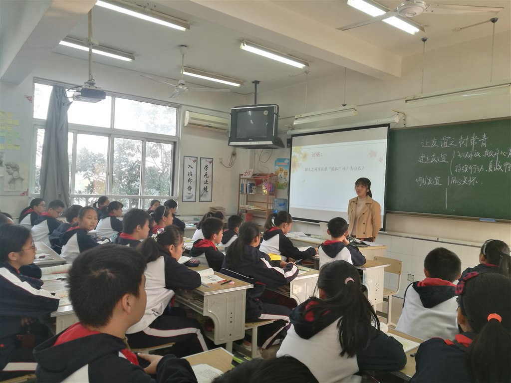 老师们先听了由河海中学周琳老师开设的《让友谊之树常青》(七年级部编教材)公开课。周老师采用“一案到底”的教学设计,围绕如何建立和呵护友谊这一主线,结合学生在交友中遇到的问题,层层推进。整个教学过程学生积极参与,思维活跃,踊跃发言,主体地位得到了充分发挥。在接下来的评课中,老师们围绕如何解决新教材使用中遇到的问题畅所欲言:面对教学内容容量大、知识点比较零散,“一案到底”的教学设计能够让学生的学习更具整体感、条理性;关注学生生活,设计学生感兴趣的活动有利于调动学生的积极性;问题的设计要有利于激发学生深入思考,培养他们辩证思维的能力;对学生的评价要多元;对学生回答的点评要清晰明了,为明理导行服务;要注重情感、态度、价值观目标的落实等。