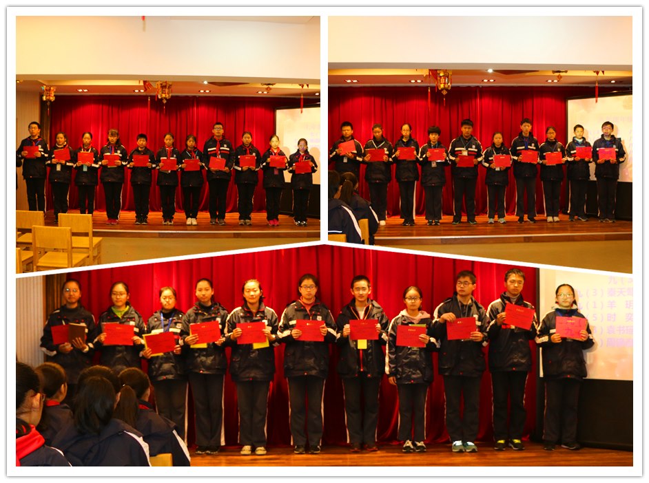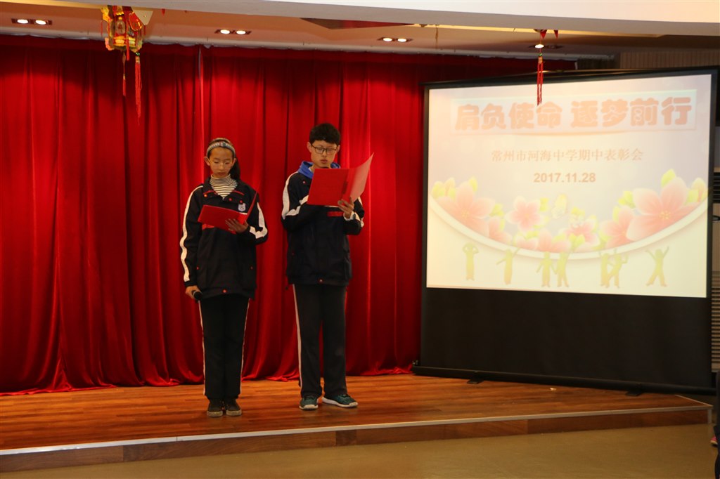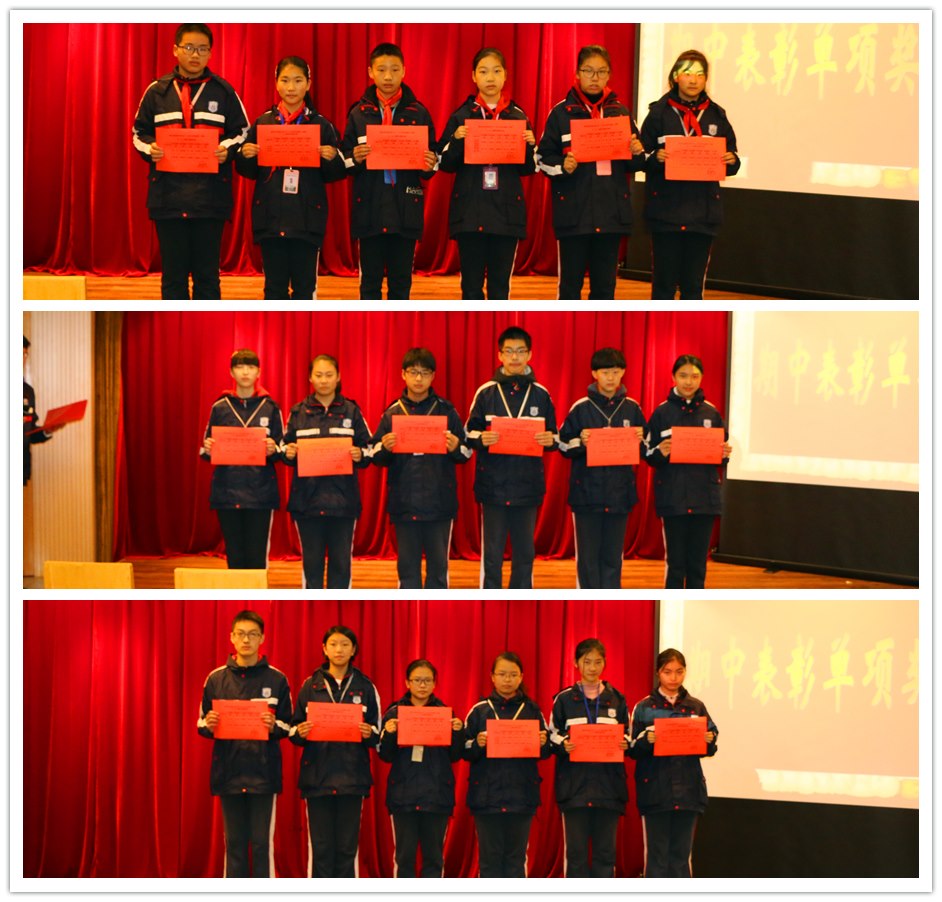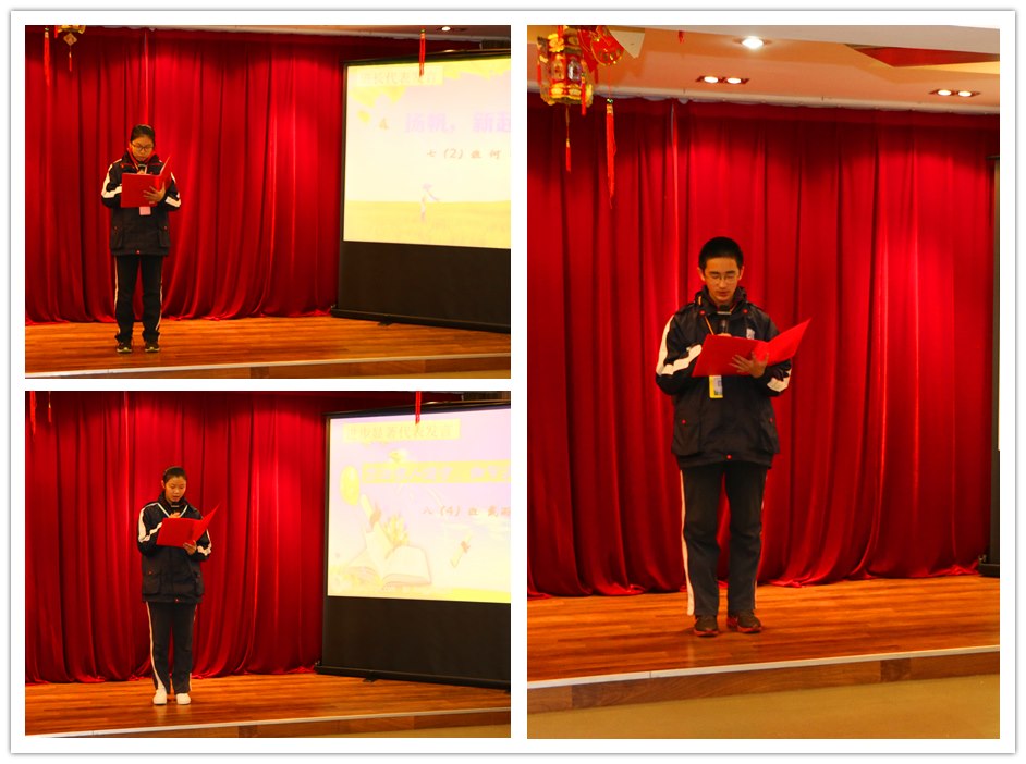 本次大会首先表彰了“好书伴我成长”征文比赛和“青春喜迎十九大,不忘初心跟党走”常州市青少年书法比赛的获奖同学。“与书为伴,以字为裙”,中华传统文化博大精深,希望在获奖同学的带领下,同学们能更深刻的感受传统文化的魅力。之后大会表彰了期中单项奖,各班班长上台领奖,戴亚萍主任向他们颁奖并致以祝贺。七(2)班班长何宁同学发表了“扬帆,新起航”的主题演讲,提出团结合作的重要性。