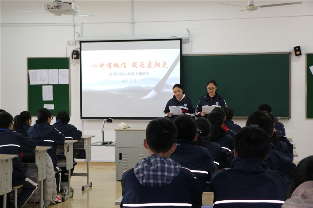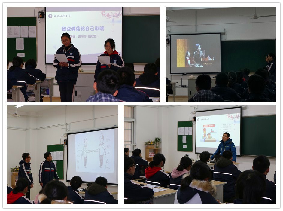 汇报课程——聆听成长声音。首先,河海中学的芦启顺老师给我们带来了一节班会展示课《心中有诚信 成长更阳光》。本次班会分为七个环节:解读诚信之义、分享诚信故事、学习诚信楷模、模拟诚信情境、诵读诚信美文、设计诚信海报、寻找诚信人物。学生主持从社会主义核心价值观导入,班主任总结从习近平总书记寄语作结,他们明诚信之知、在解读中内化,学诚信之事、在榜样中熏陶,辨诚信之行、在思辨中提升,悟诚信之美,在诵读中成长。环环相扣、层层深入,精彩表现让我们看到了一个充满正能量的班集体。