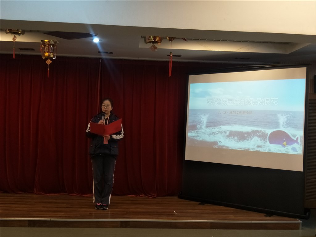 八年级六个班级别具匠心, 各班班长都妙语连珠,滔滔不绝。八(1)班以“回顾2017、展望2018”为中心,向我们展现了班集体的团结和睦、分工明确,令我们心生感叹。八(2)班化身为“河海中的一滴浪花”,他们的“ren”文化深入人心,让我们看到了老师与同学互帮互助的大家庭。八(3)班则拥有着一种“乘风破浪”的坚毅精神与知错就改的良好习惯,在八年级“更上一层楼”。八(4)班班长以幽默风趣的演讲叙述着他们“星光璀璨”背后的成长史,他们的班级管理制度创新有趣,无不让人啧啧赞叹。八(5)班简洁明了地向我们展示了同学们在常规、学习、生活等方面的进取之路,总结了同学们在一学期中的突出表现,体现了较高的班级凝聚力。八(6)班最突出的则是在班主任的带领下,开展了一系列有特色的班级活动,那不仅是一种爱的传递,更是一种文化的熏陶。