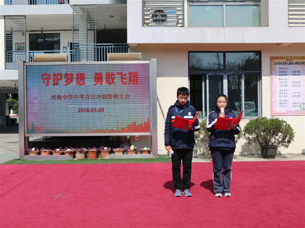 河海中学九年级全体师生将以此次誓师大会为起点,以坚定的信念、饱满的热情、昂扬的斗志、坚韧的毅力,去挑战100天,决战中考。我们相信,河海学子会在中考考场上绽放耀眼的光芒。
