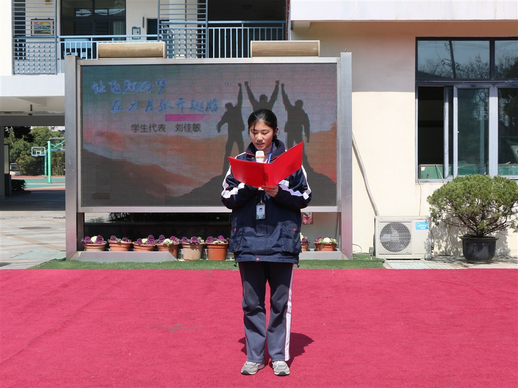 九(2)班的刘佳敏作为2018届毕业班学生代表发言。她声情并茂地道出同学们的心声:惟有拼搏,才能在被失败击倒后,拍拍裤脚重新站起来;惟有拼搏,才能使曾经经历过的生活,无怨无悔。在这最后的冲刺中绝不能气馁,所有的所有都包含在两个字当中——奋斗。并倡议大家珍惜这百日光阴,将青春的豪迈和铮铮誓言化作务实的行动,去冲刺,去迎战,去谱写河海中学新的华章,让飞翔的梦在六月张开翅膀。