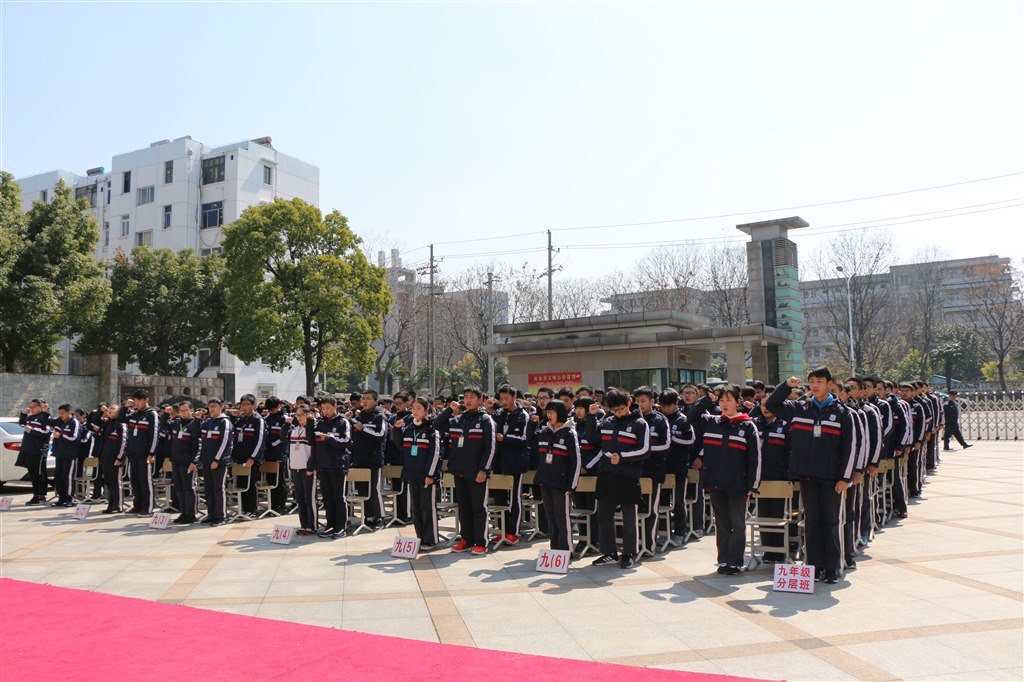 03月09日12点18分河海中学2018届九年级毕业生齐聚学校小广场,隆重举行了以“守护梦想,勇敢飞翔”为主题的“中考百日冲刺誓师大会”。学校领导及九年级全体老师出席了本次大会。