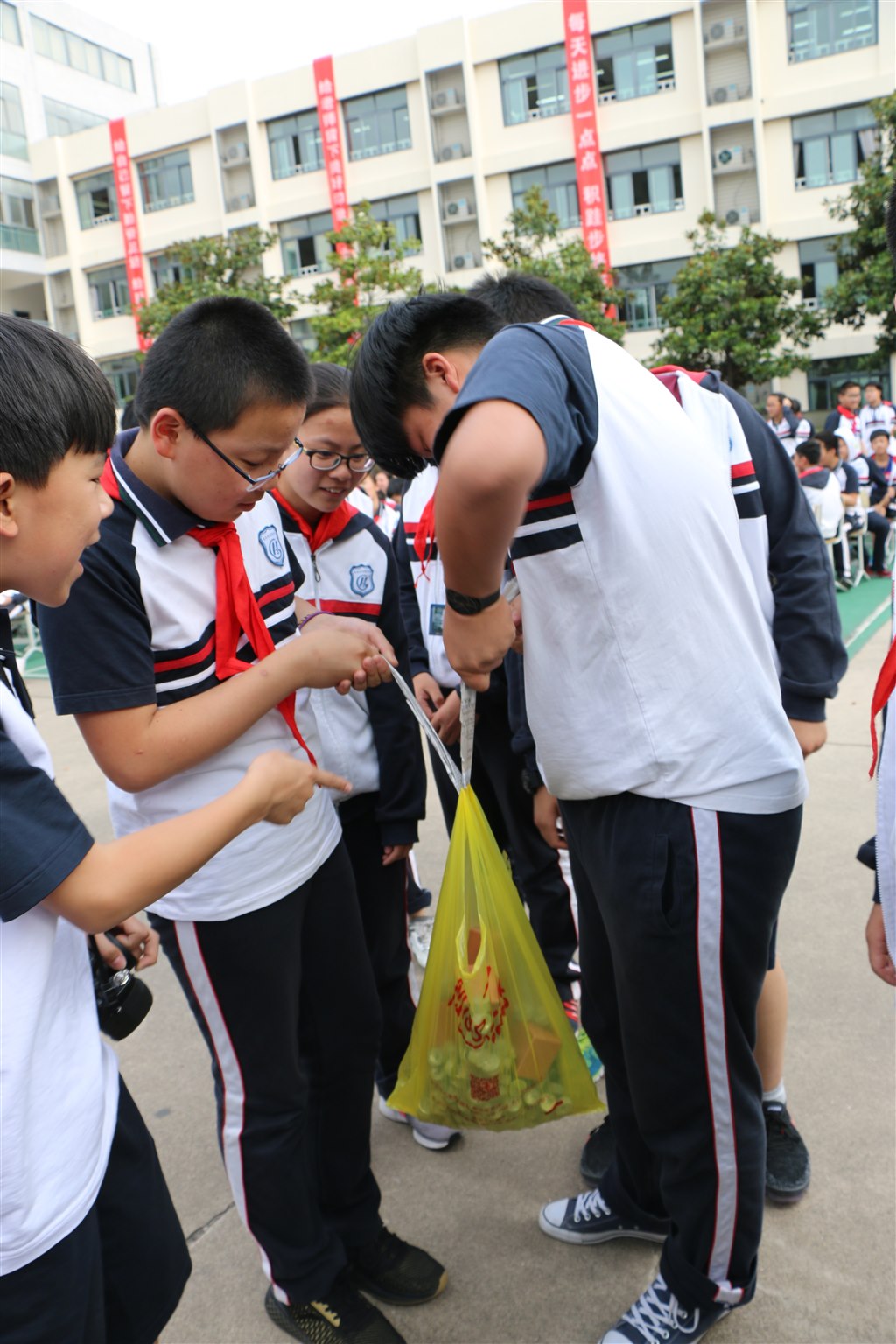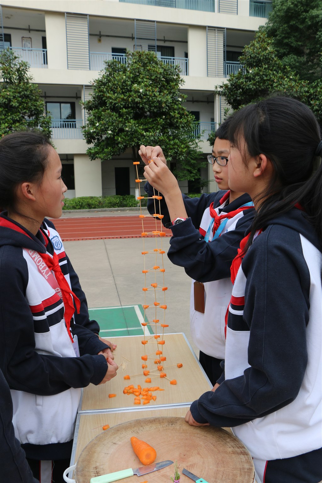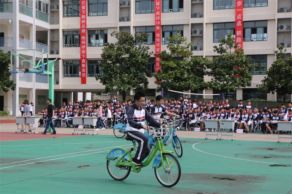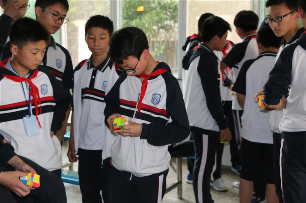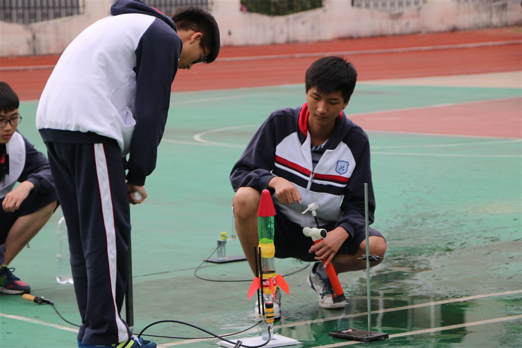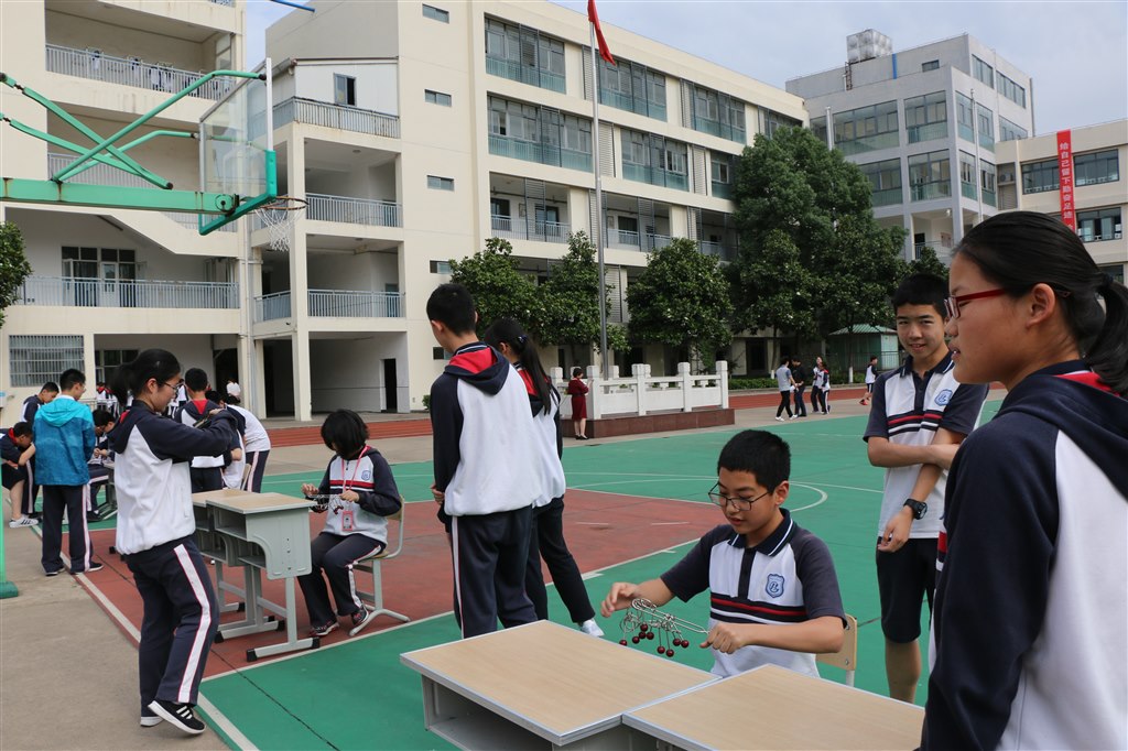 首先进行的比赛项目是七八年级自行车慢骑,给本次活动带来一个小高潮,同学们高呼参赛选手的名字,为他们加油,当他们失误落地的时候又不禁为他们可惜。紧接着开始进行七八年级的其他项目,在“节能建筑”中他们团结协力,共同搭高,用100根牙签和一根胡萝卜搭出了尽可能的高度;在“九连环”和“魔方”挑战中,他们埋头苦干,拼速度、比时间;在“越高越好”项目中,参赛队集思广益,一把剪刀、一张纸高高地撑起了数枚硬币;在“纸绳提重”中,他们积极动手,发挥想象力,让一张小小的报纸承受了巨大的重量。接下来,七年级同学进行“高空迫降”挑战,每一样比赛作品都凝聚了同学们的心血和智慧。八年级的同学进行“水火箭”和“潜水艇”挑战,参赛队员团结一心,精心研发了各式独特的作品,一次次喷射声将水火箭推向高空,制作的潜水艇在水中也能如“蛟龙号”般上浮下沉。