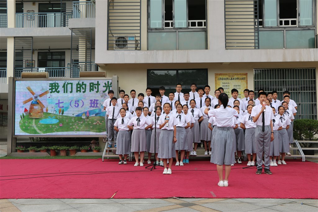 歌声相伴,我们快乐成长。仪式在《中国少年先锋队队歌》铿锵有力的节奏中拉开帷幕,全体即将离队的少先队员们唱起了这首伴随着童年时代的歌曲,内心的激情澎湃在此时又增添了几分感慨。随后,七年级班歌比赛正式开始。七(1)班率先登场,用热情似火的《大梦想家》点燃整场的气氛,唱出对梦想的执着追求;细嗅芬芳,耳边传来轻快的歌谣,那是七(2)班深情款款的《Lemon tree》,伴我们一路寻觅美好;七(5)班的《我们的时光》充满青春活力,更是增添了浓郁的校园气息;七(3)班老歌新唱,经典歌曲《闪闪的红星》仿佛让我们看到那新长征路上一代代奋发图强的新景象;拥有蓬勃朝气的七(4)班同学向青春致敬,跟随着他们的《奔跑》,我们拉近了现实与梦想的距离;七(6)班则用一首《蝴蝶飞呀》来吹响青春的号角,永远激励着河海学子勤奋踏实,激流勇进!六个班都以不同的方式亮出了班级的风采,在迈出青春第一步的庄严时刻,他们用歌声唱出了激情,用歌声描绘了更加美好的蓝图,也表达了自己对未来成长路程的坚定信念。